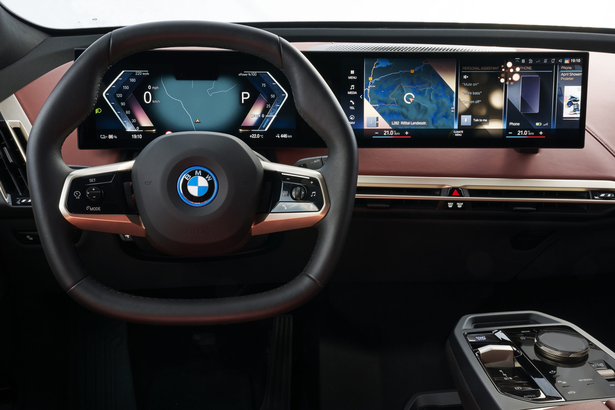 En el interior tiene un volante hexagonal y materiales de excelente calidad. Incorpora una enorme pantalla curva que integra el panel de instrumentos de 12.3” y una superficie táctil de 14.9” que incluye el nuevo sistema iDrive con un mejorado asistente personal digital, actualizaciones inalámbricas y tecnología móvil 5G para la transmisión de datos. Trae sistema de sonido Harman Kardon con parlantes en los apoyacabezas, aunque opcionalmente se podrá pedir un Bowers & Wilkins Diamond Surround con audio 4D.