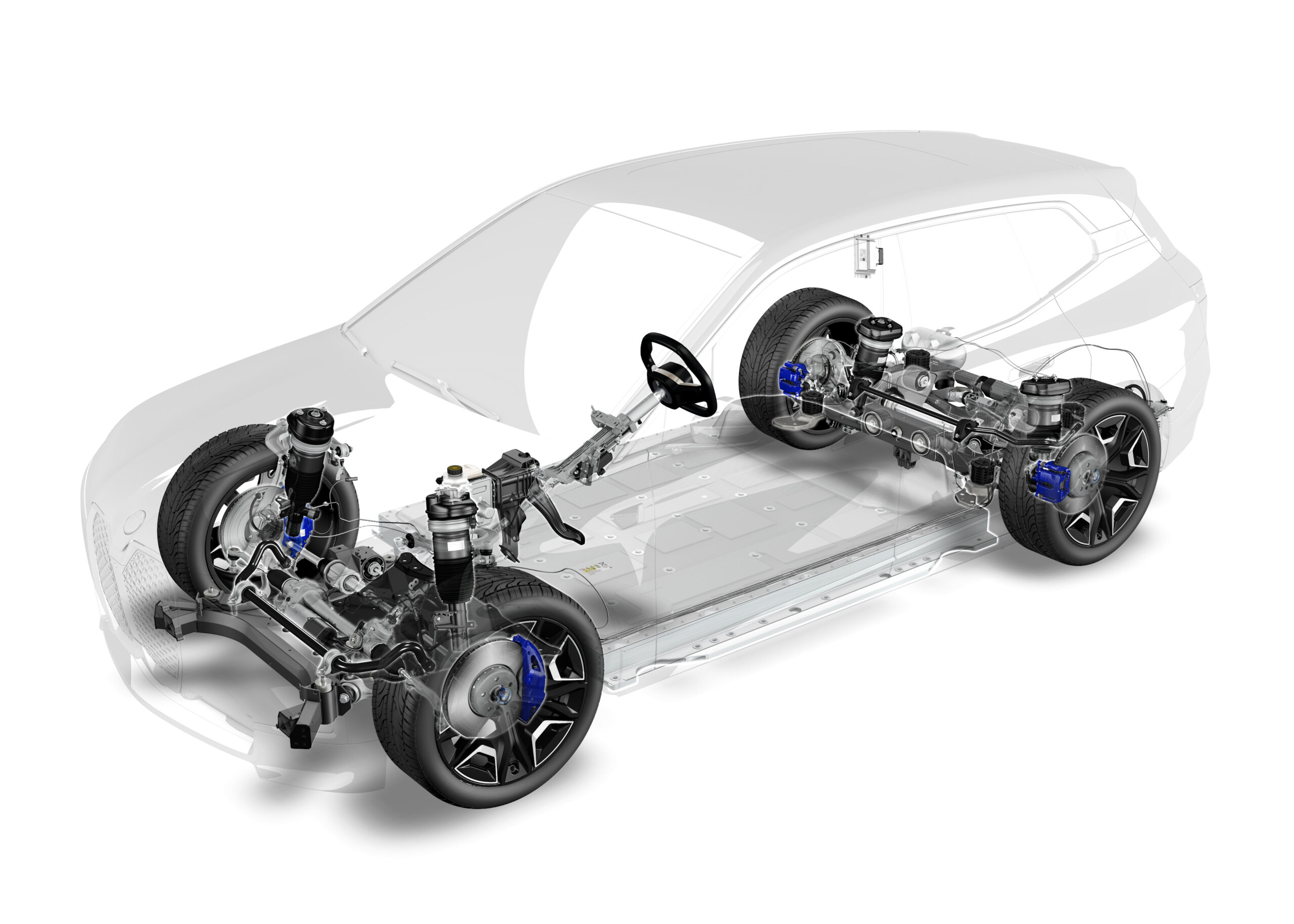 De serie tiene amortiguadores de altura controlada, como opción están el sistema neumático, amortiguación controlada electrónicamente, dirección activa integral, frenos deportivos y rines Air Performance de 21” y 22”, con llantas que producen poco ruido.