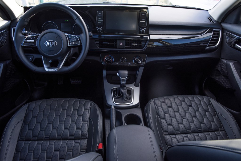 La Seltos Emotion equipa una pantalla táctil de fábrica de 8” con conexión a Android Auto y Apple CarPlay, 6 parlantes, puerto USB, climatizador manual, asientos tapizados en tela, segunda fila de asientos reclinable, columna de dirección ajustable en altura y profundidad, vidrios y eléctricos, faros halógenos y acceso sin llave.