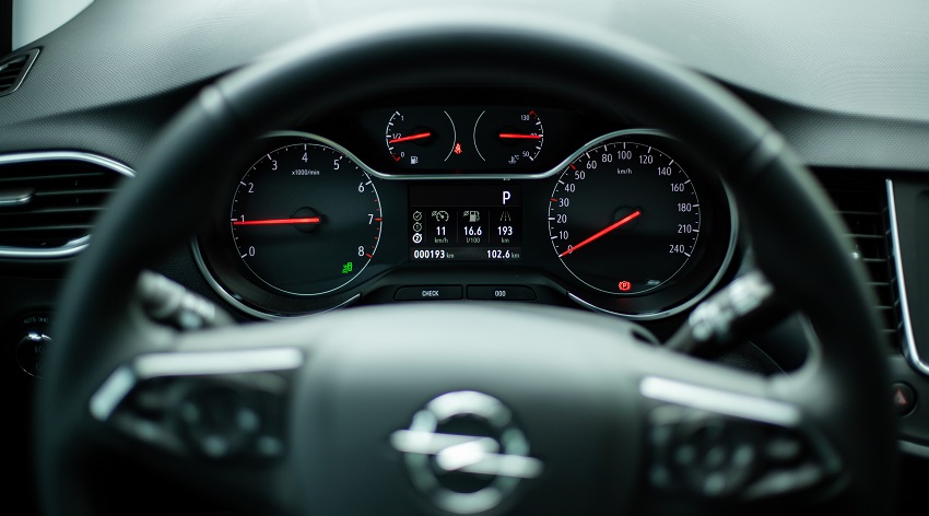 El tablero cuenta con materiales suaves al tacto en la zona superior, una franja gris brillante y plásticos duros de alta resistencia en la zona baja, al igual que en las puertas. Un dato curioso es que, en el soporte lateral derecho de la guantera, Opel ha escondido un pequeño tiburón. El volante se encuentra forrado en cuero con controles multimedia y búsqueda por voz en su lado derecho y botones para el control crucero en la zona izquierda.